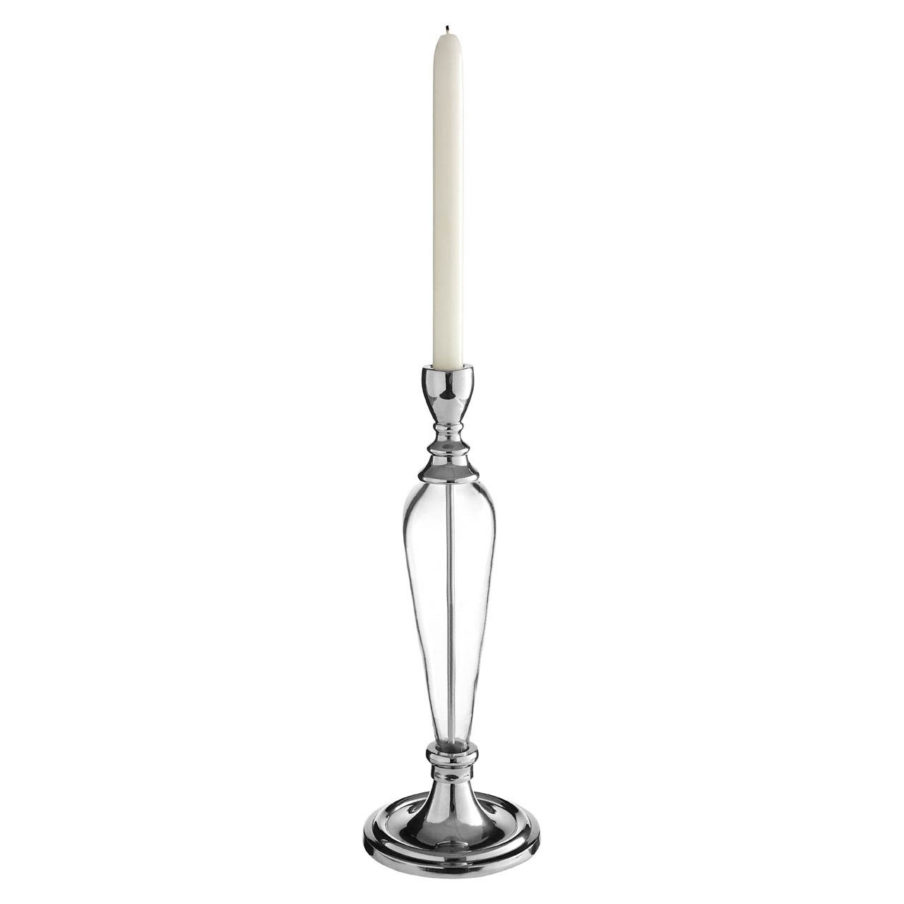 The Beauchamp candle holder boasts traditional design lines at its base and upper section, with a reflective nickel finish that gives it a contemporary look. In between the metalwork sits a clear glass stem with rounded shoulders and a tapering body. A pillar candle can be displayed in its egg cup-shaped sconce. Materials: Aluminium, Glass, Nickel FEATURES: Boutique hotel style, Reflective nickel, Clear glass stem, Traditional design lines