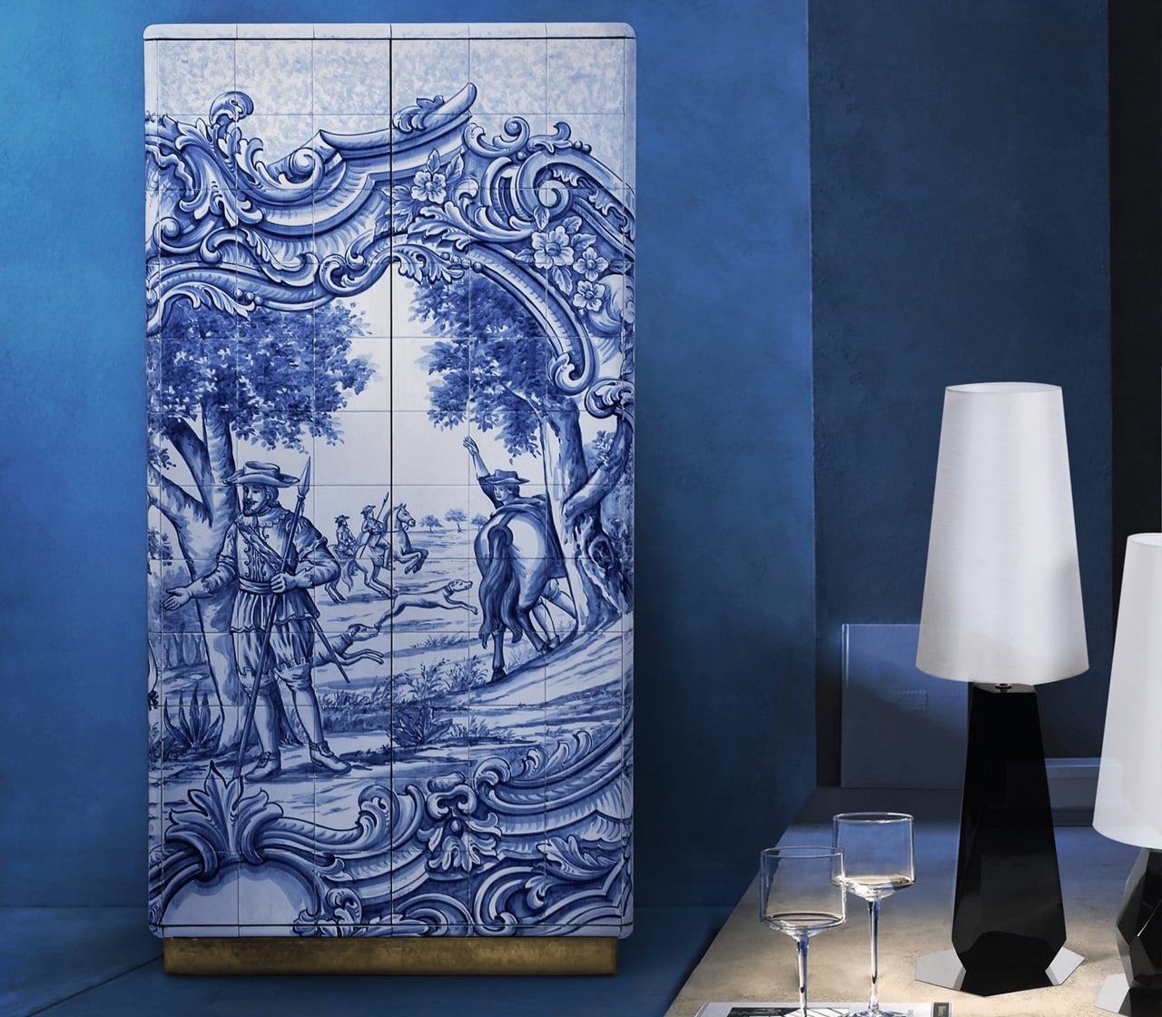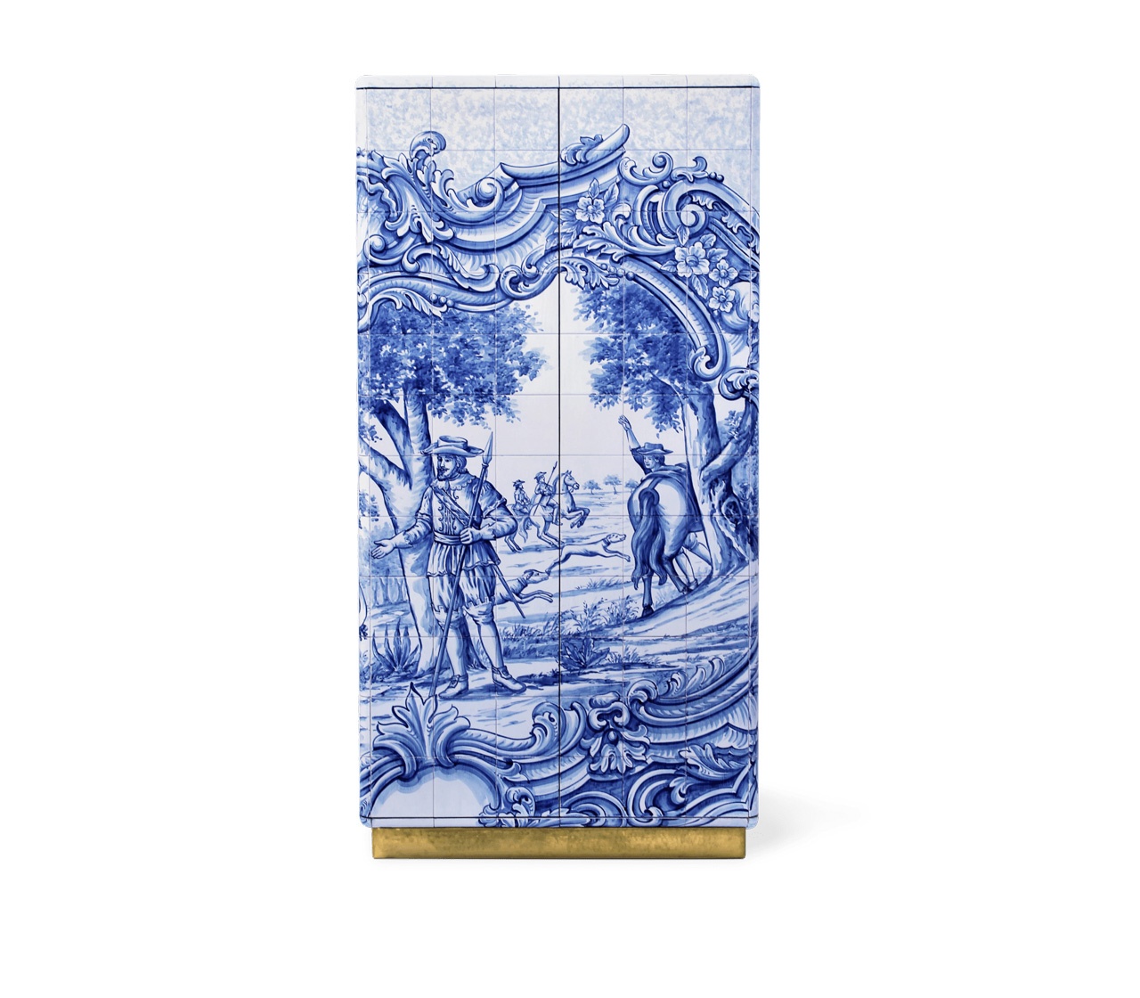 Gold leaf, hand painted tiles, brass, glass, white lacquered wood.