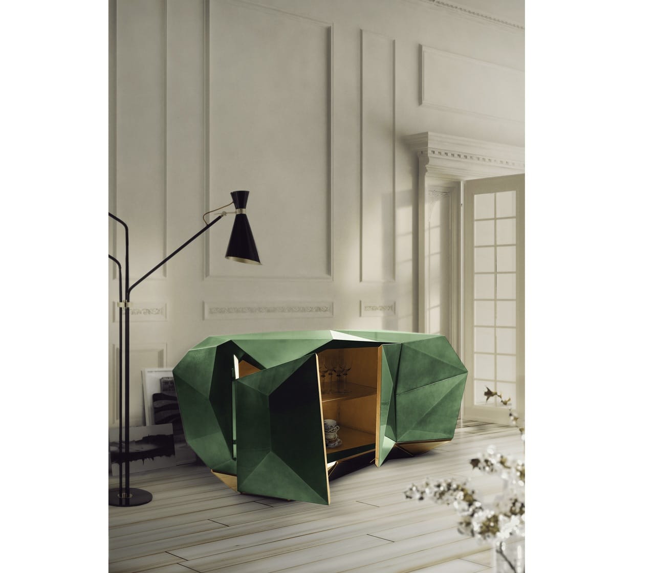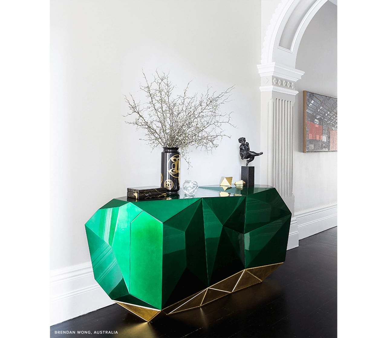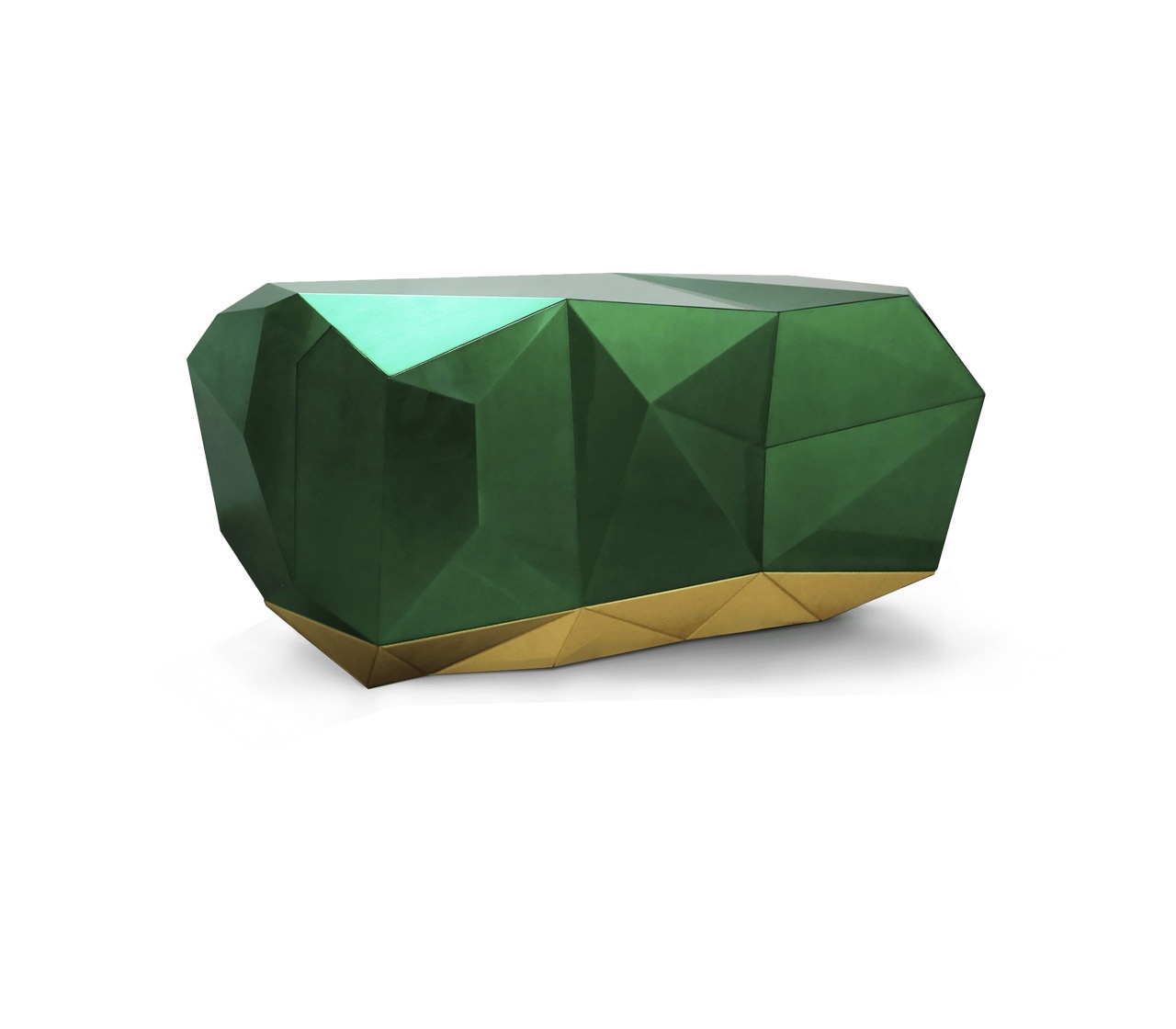 High gloss varnish, emerald translucid color over silver leaf. Wood structure. Interior: Gold leaf (1 shelve and 2 drawers) Base: Faceted Base, gold leaf with gloss varnish.