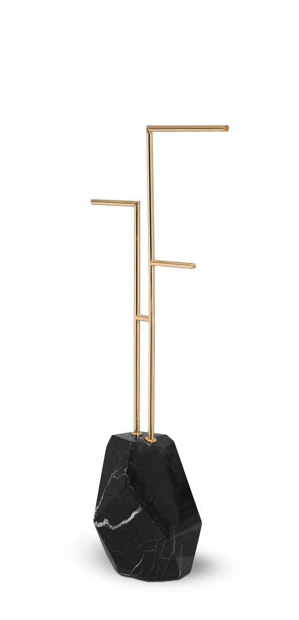 Charles Mahoney is a three-tier towel rack produced in polished brass and supported by a diamond shaped base built in Nero Marquina marble. Enhance your bathroom decor with this sleek and contemporary design piece produced with attractive high-end finishes.