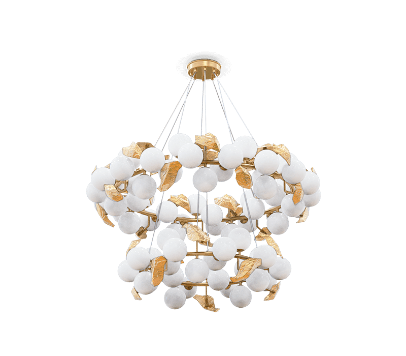 A modern lighting fixture with round structure made of brass. The bulbs can be either white or transparent.