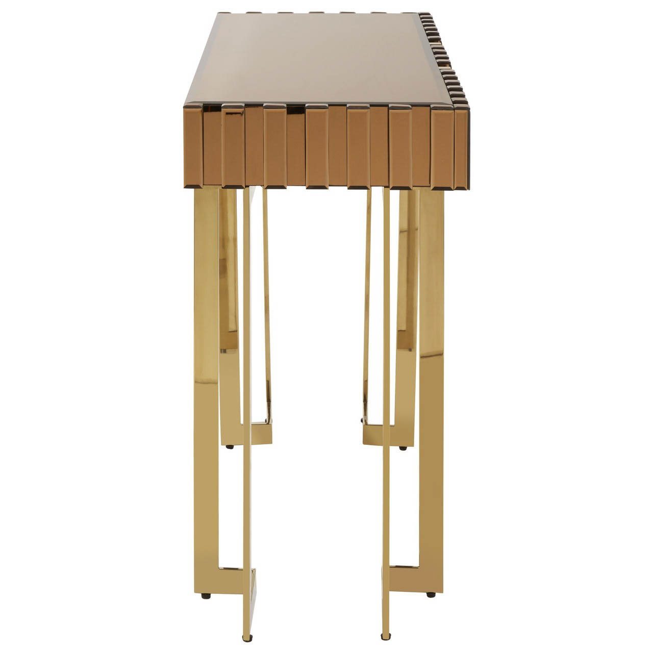 Danube Console Table Materials: Glass, MDF, Stainless Steel Features: Gold finish glass top, Embossed linear bars detail, Stainless steel legs, Warm metallic finish, Luxe