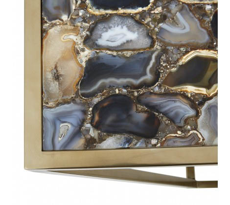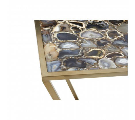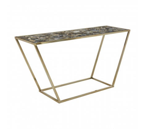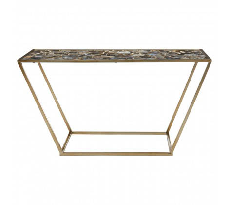 The stylish Frankland console table boasts a polished agate top with varying shades of blue combined with natural tones. The table’s geometric frame has four angular legs and is created from robust steel. The frame’s warm gold finish complements the natural tones within the agate top and enhances the table’s luxurious appeal. Materials: Steel, Stone FEATURES: Natural agate stone, Sturdy steel frame, Gold finish, Luxe statement piece