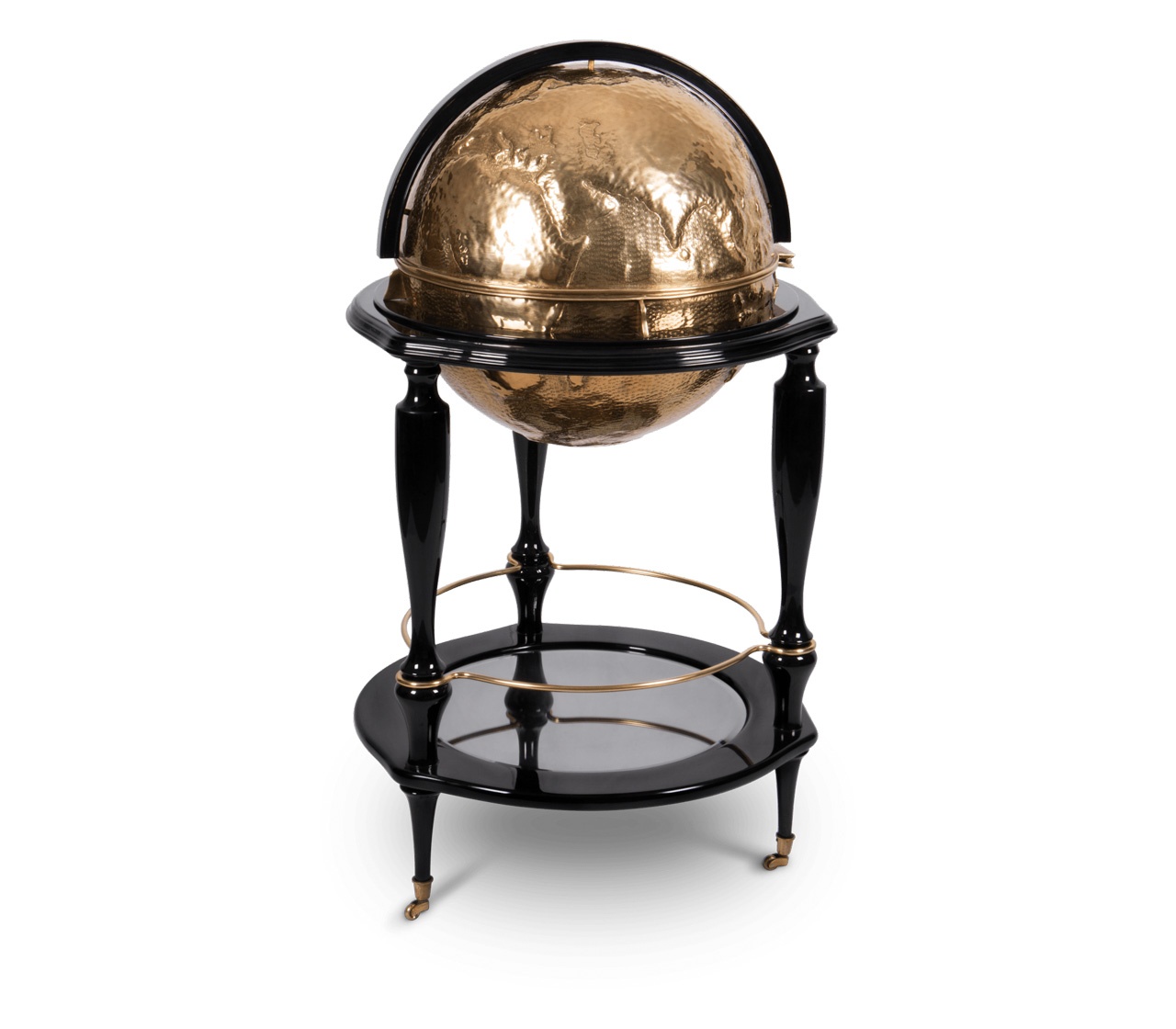 Product Features: Black lacquered wood, hand carved polished brass and tinted glass.
