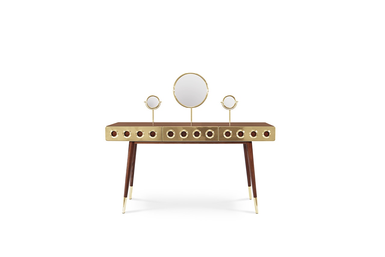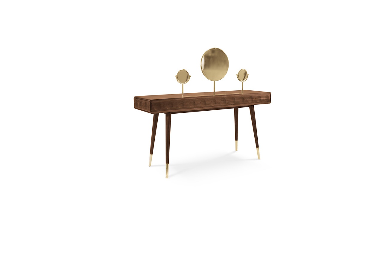 A striking addition to your glamorous boudoir, Harry Morley dressing table has a mid-century feel and is constructed of solid walnut wood and offers three front drawers produced in gold plated brass. This retro table is supported by atomic legs and features a set of 3 bullseye mirrors with a brass rim. The smaller ones rotate vertically, providing flexibility.