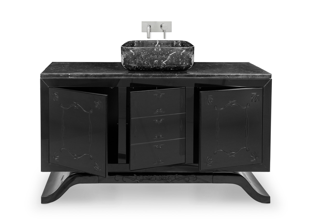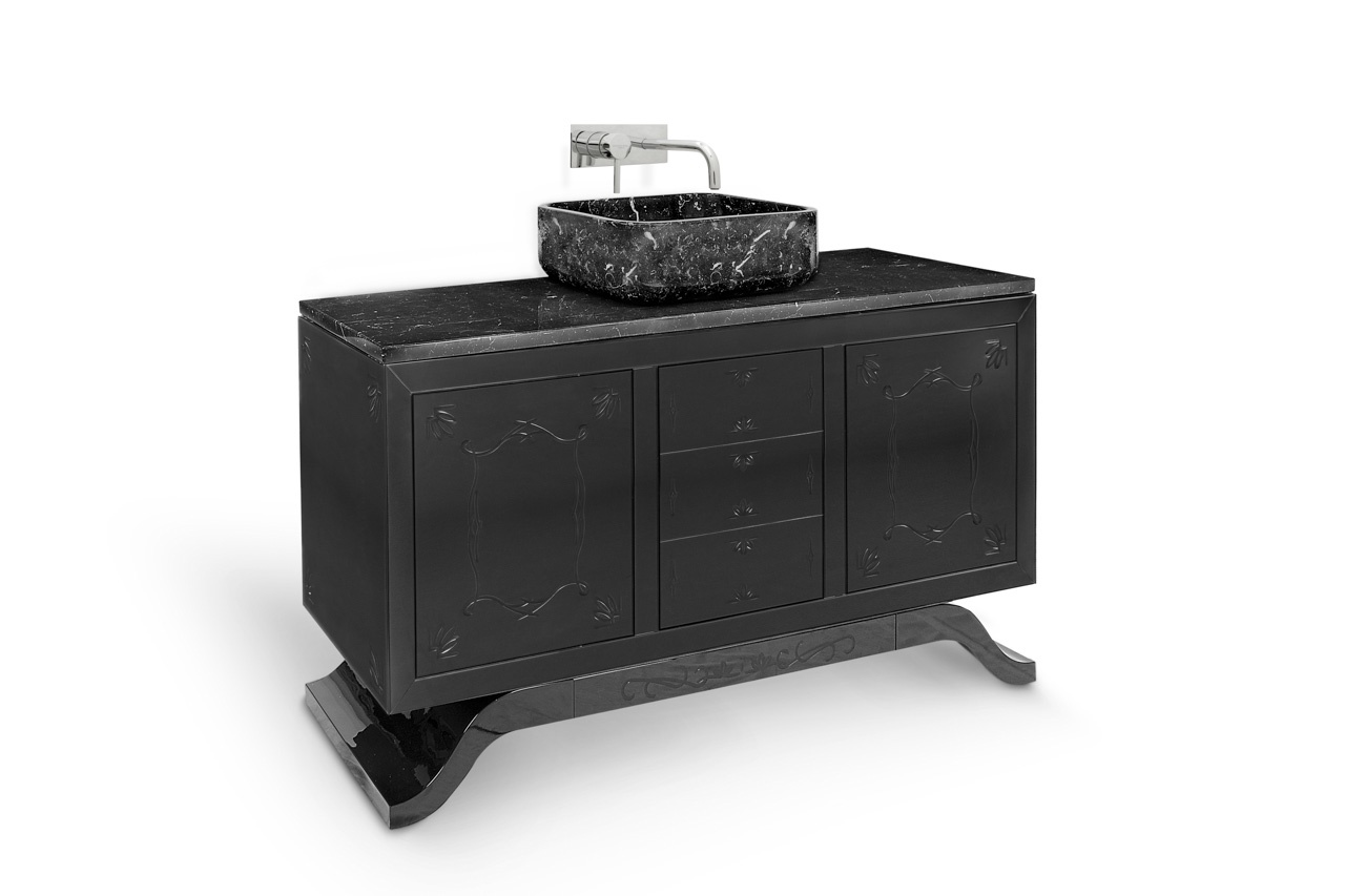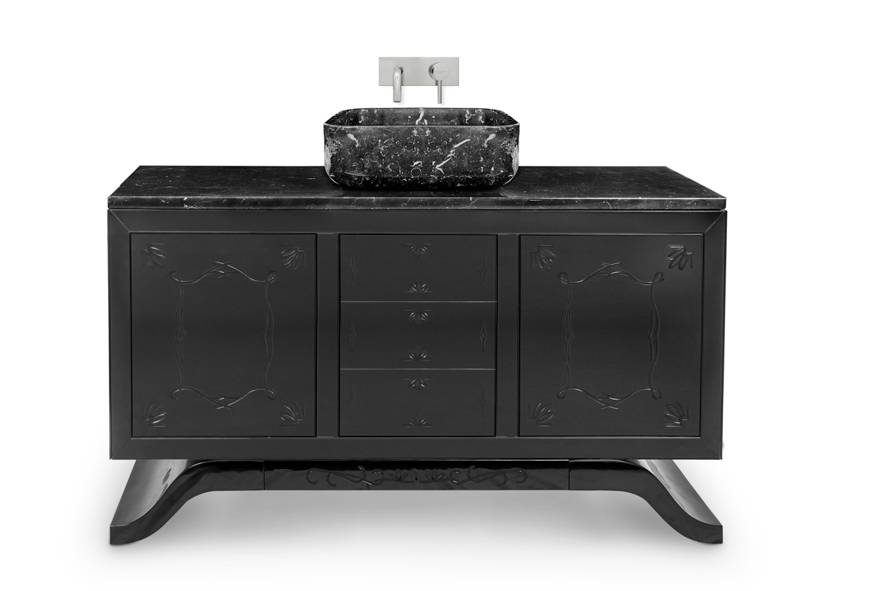 Inspired in The Ian Davenport Museum of Art, this washbasin resembles a central mausoleum structure, blending the contemporary chic urban attitude with the classic sober lines. The wooden structure and feet are black lacquered with a high gloss black varnish, featuring a carefully handcrafted carving detail on the glass doors. It has a countertop and rectangular sink made of Nero Marquina marble, making this piece extremely elegant and luxurious.