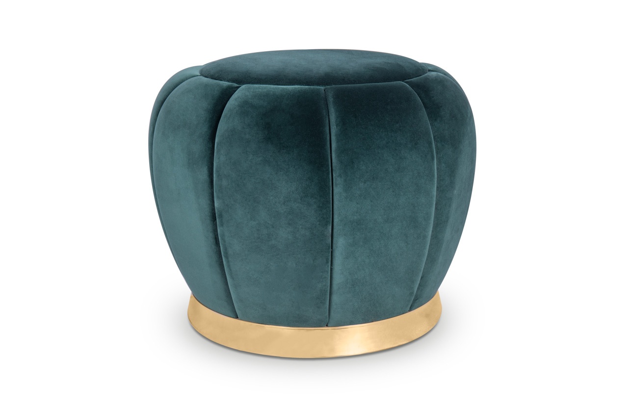 John Collier is a low stool both fun and practical. It has a somewhat cylindrical shape and a cushioned seat upholstered in velvet fabric, creating a soft and comfortable solution for your living room. Its base is made of polished brass, so it boosts some gold details over its trendy pastel colors available in the customization.