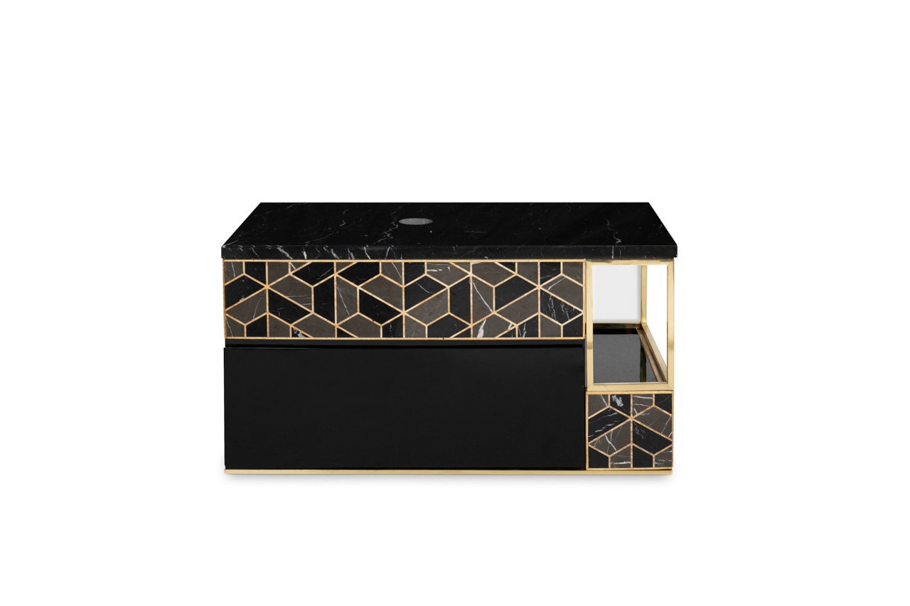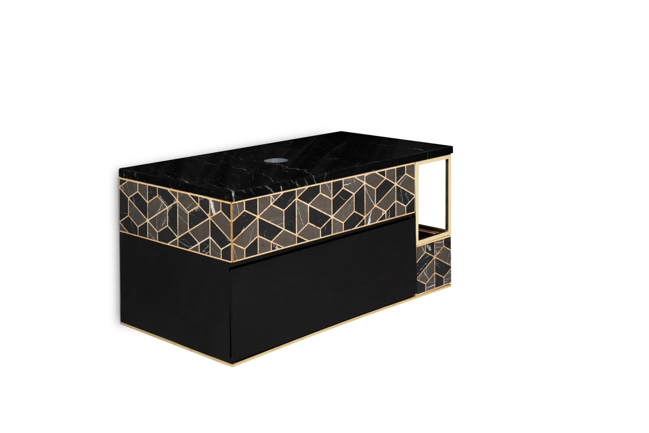 Black, grey and golden colors perfectly blend on this marvelous piece, inspired by the tortoise hard outer shell. A perfect combination of superb design and foolproof functionality, this cabinet includes two spacious black lacquered drawers, as well as a lateral shelf. A great choice to maximize the space in your bathroom!