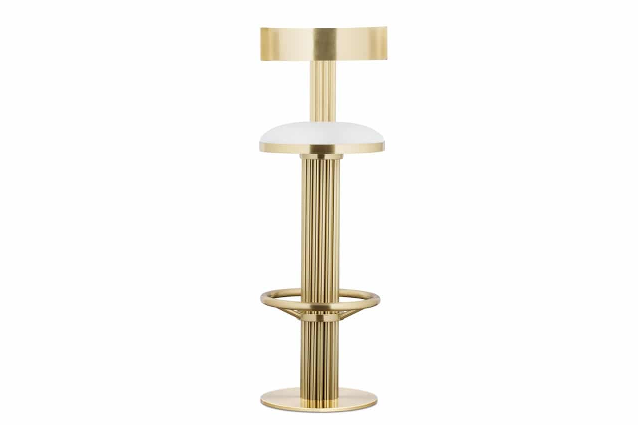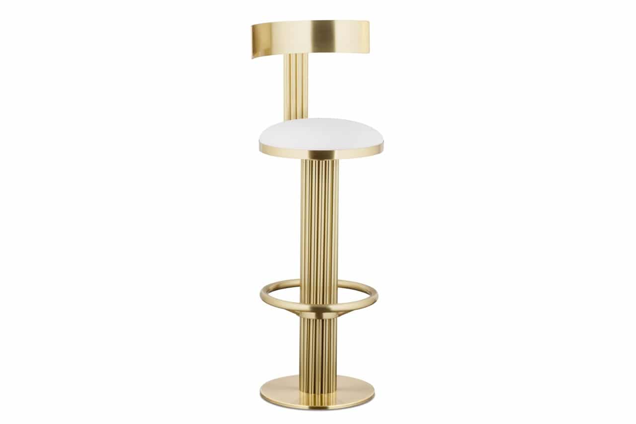 Maggi Hambling Bar chair, it’s stylish, comfortable and stand the test of time. The body is a full piece of polished brass and features a low back, a foot rail and brown leather on the seat.