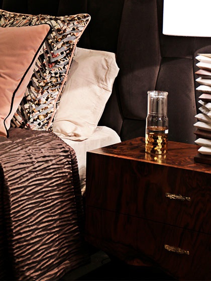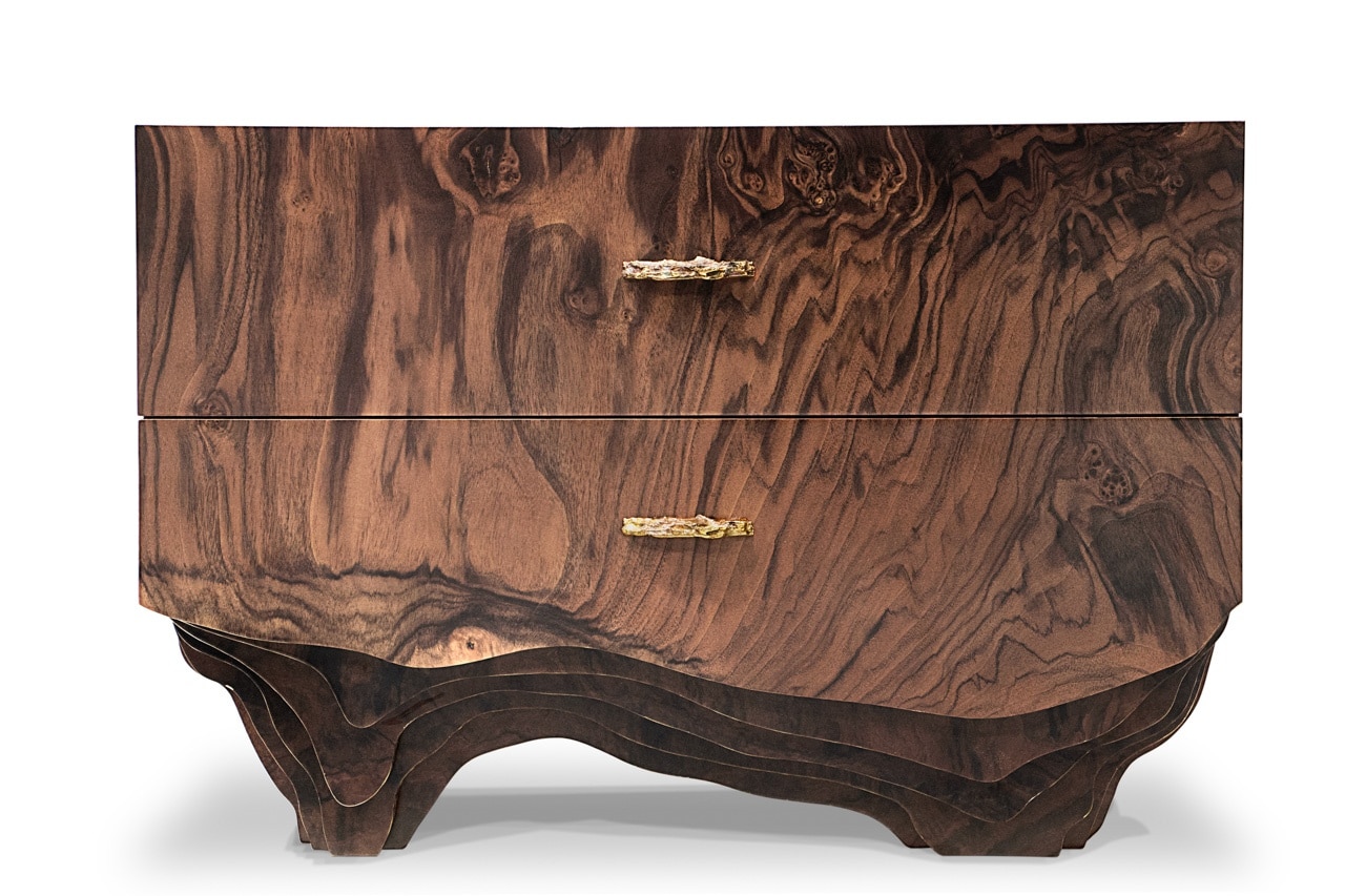 Maria Marshall Bedside Table. It features an outside in walnut root veneer, an inside in rosewood veneer and details in matte hammered brushed aged brass. This wood bedside table brings instant character to modern interior design.