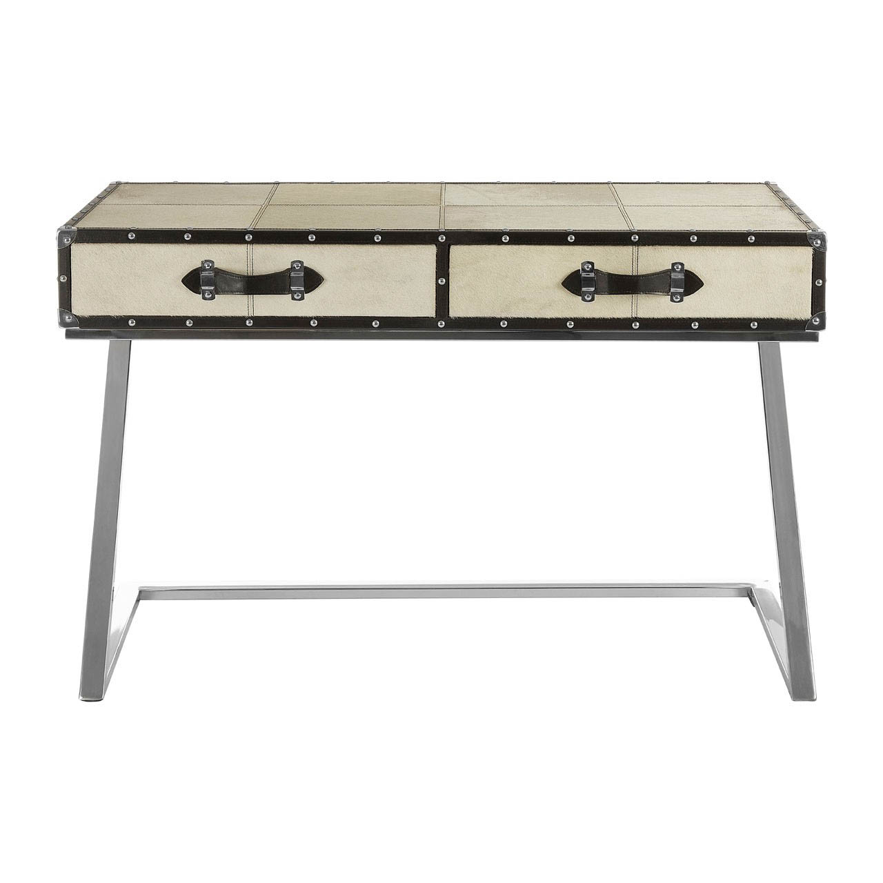 Oakfield Console Table Genuine Leather Mango Wood Materials: Genuine Leather, Mango Wood, Plywood, Stainless Steel Features: Genuine hair-on-leather, Metallic stud detail, Polished stainless steel legs, 2 drawers