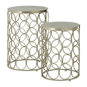 Constructed from strong iron, the frame of each table is notable for the beautiful oval metalwork that is clasped together to form a drum shape. A light silver finish accentuates their elegance. Polished marble surfaces lend each table an added layer of luxury. Use them to accent a fusion/traveller design setting. *This item is handcrafted so please expect slight variations to the finish* Materials: Iron, Stone Features: Polished marble surfaces, Beautiful metalwork, Handcrafted, Traveller/fusion style