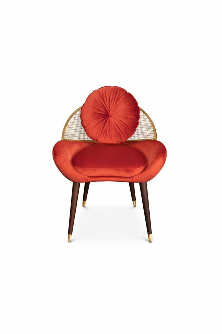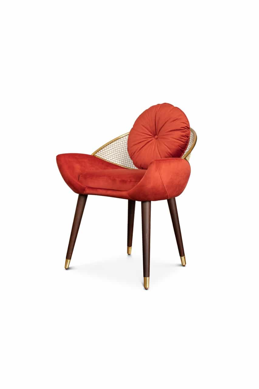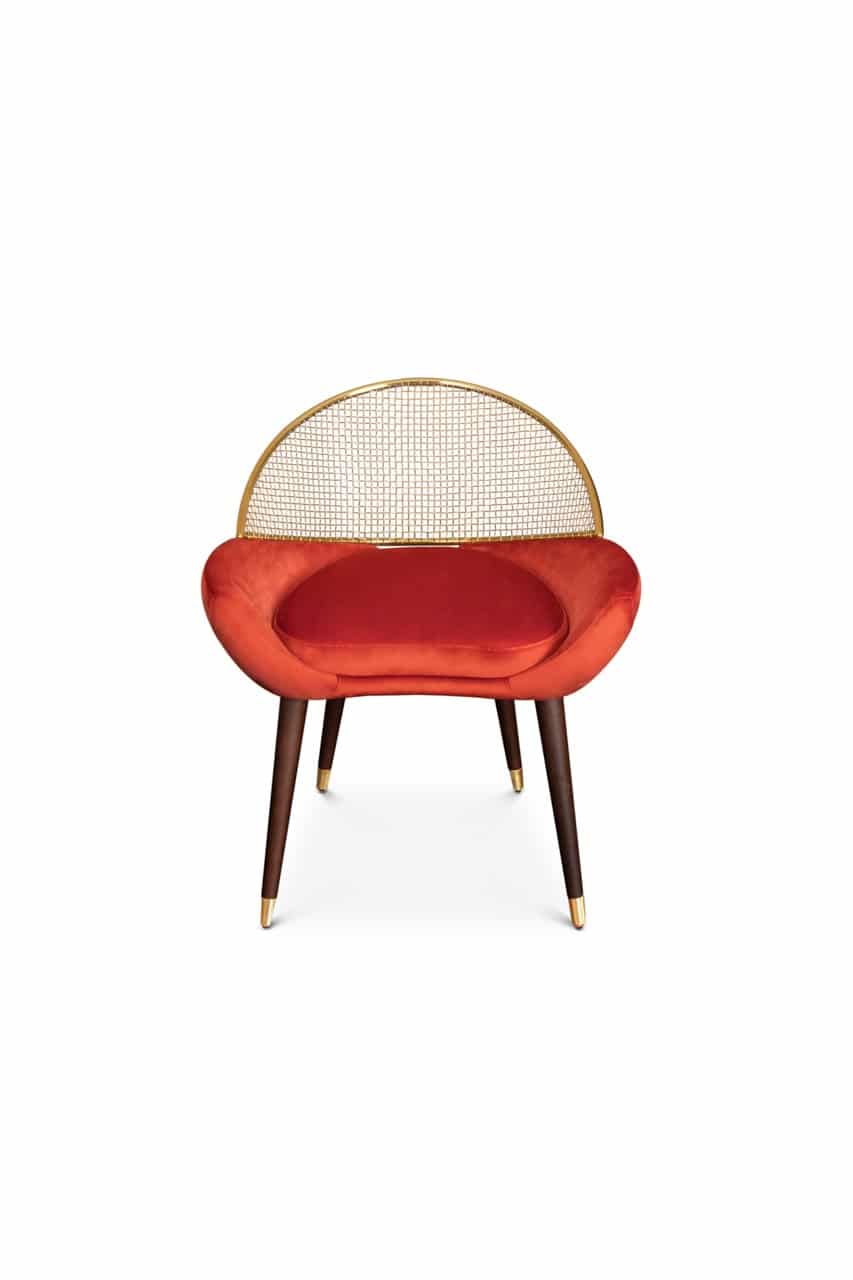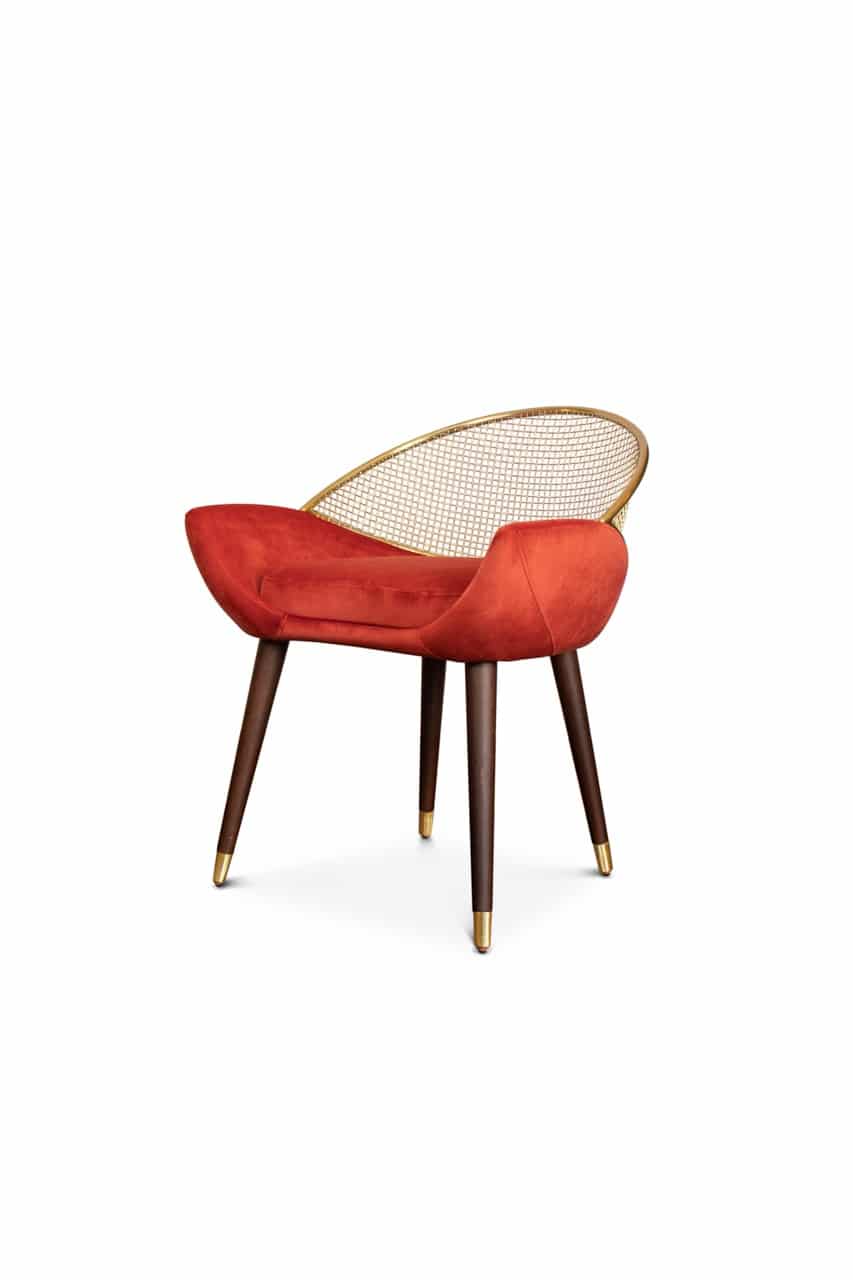 Paul Mellia features a velvet upholstered seat with a removable cushion and a crescent low back handmade in brass, finished in plated copper. It’s supported by four solid walnut wood legs that sit atop copper plated feet, making it a timeless modern dining chair.