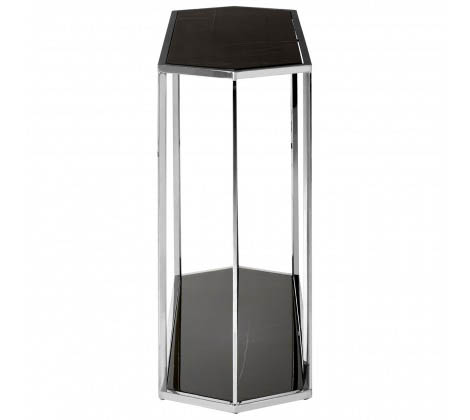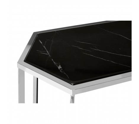 Sleek black marble is set into the top and base of the frame, lending an organic element to this contemporary minimalist statement piece. The frame is crafted from solid steel and has a silver finish that contrasts with the black. Materials: Stainless Steel, Marble FEATURES: Contemporary design, Sleek black marble, Silver finish stainless steel, Statement piece