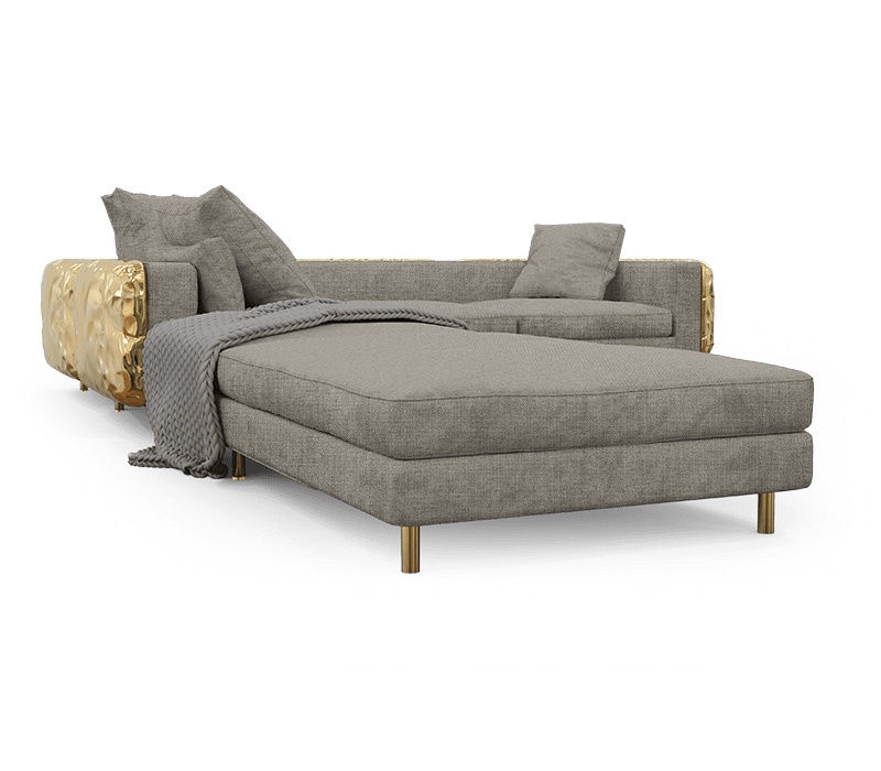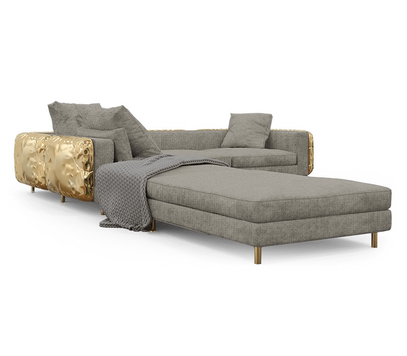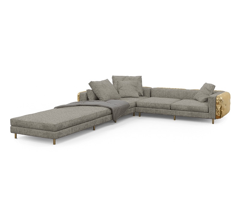 Scarsdale L-Shaped modern sofa paired with upholstered ottoman. Solid wood structure enveloped by polished brass, founded on slim brass feet.