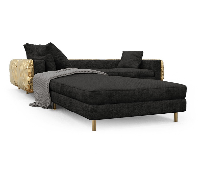Scarsdale L-Shaped modern sofa paired with upholstered ottoman. Solid wood structure enveloped by polished brass, founded on slim brass feet.