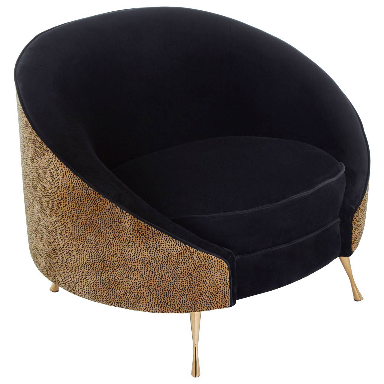 Skinner armchair, black / leopard print, antique gold finish legs Materials: Polyester, stainless steel Black velvet upholstery, Leopard print, Antique gold finish legs, Curved armrests