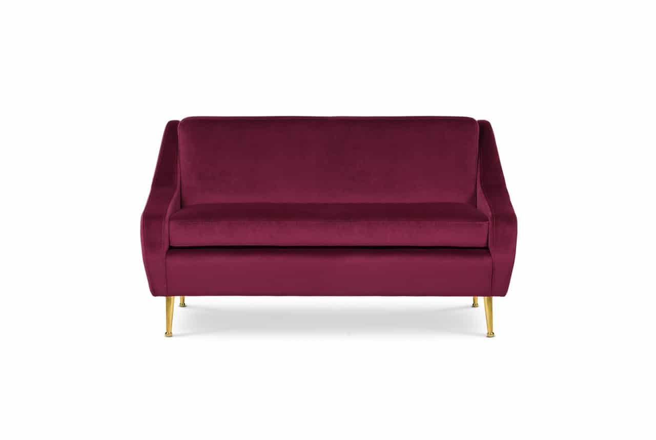 A contemporary mid-century modern style sofa featuring strong shapes and hard edges along with a rich velvet fabric, tapered legs made of polished brass and a degree reclining back that provides a contrast of shapes, making this a sofa that is versatile as both a living room sofa or a lounge sofa for a chic bar.