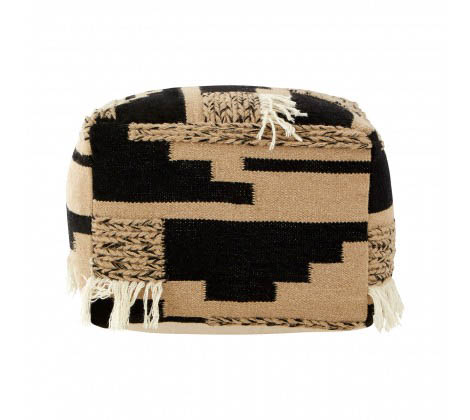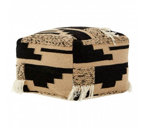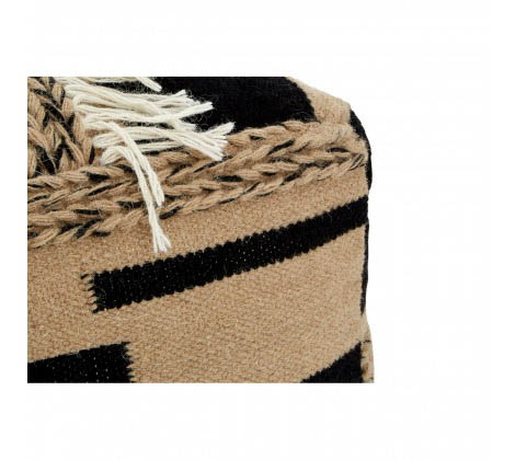 The cover of this plump square pouffe is made from a rich wool and cotton mix. The braid panels on its sides and top are accented with white coloured tassels that provide a clean counterpoint to the pouffe’s rich brown and inky black colour scheme. Use it to introduce a tribal accent to the living room. Materials: 90% Wool ,10% Cotton FEATURES: Braid and tassel detail, Rich wool and cotton miz, Brown and black tones, Tribal design