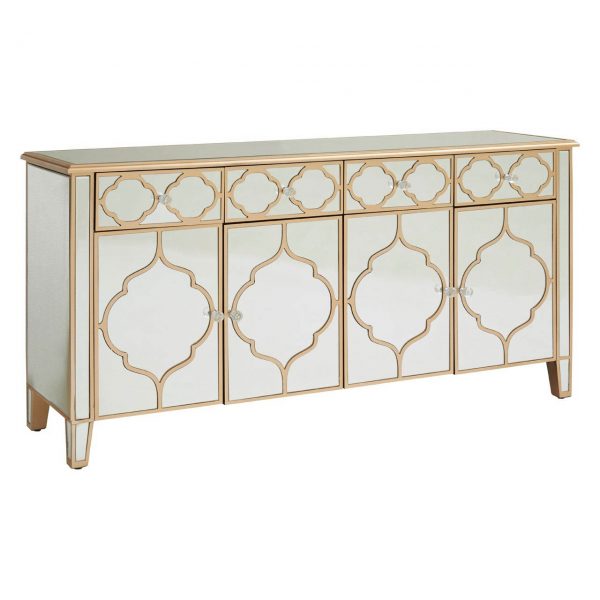 Walpole Sideboard Materials: MDF, Crystal Mirror Features: Mirrored glass, Luxe style, Warm gold finish, Arabesque detailing