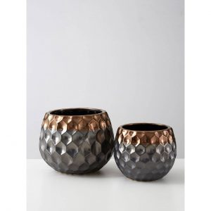 This luxury planter is made from tactile porcelain. Its dark silver and rich copper tones have a gently weathered finish that helps the planter to catch the light. The hexagonal honeycomb surface gives it a textured look while accentuating its curved lines. Style it with metallic toned textiles and lighting. Materials: Porcelain FEATURES: Geometric, Contemporary, Metallic tones, Luxurious accent piece