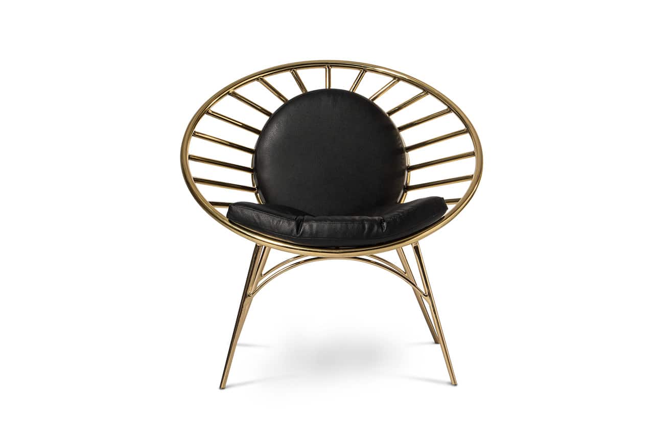 An accent chair that could easily be considered a piece of futuristic furniture, due to its edgy and stylish design. The chair-back and legs are made of a tubular brass structure, simulating a crescent bow on the back, typical of a Sasha Jameson chair of choice