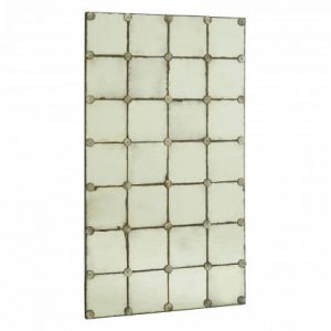The panelled design prevents the distressing from becoming overbearing – instead, the lines draw one into the variety of tones on display. The resulting weathered look gives it an aged aesthetic. Materials: Glass, Metal, Plywood FEATURES: Antiqued glass, Panelled design, Aged aesthetic, Green and black tones